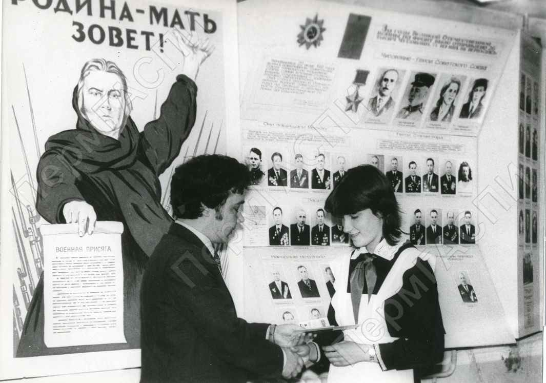 I секретарь Чусовского ГК ВЛКСМ Крюков С. вручает комсомольский билет ученице школы № 1 Лавровой Светлане. Народный музей