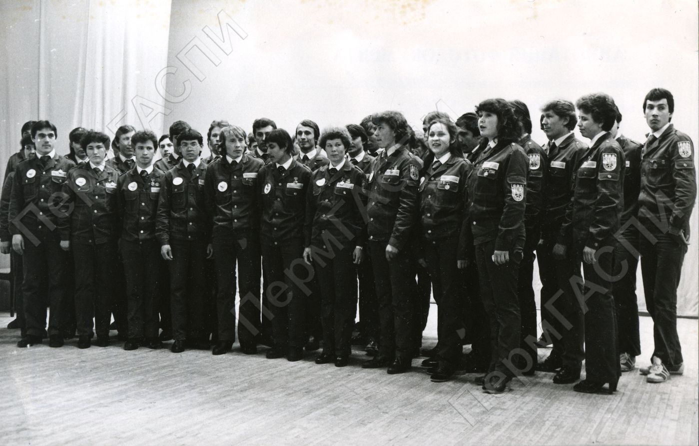 Вечер знакомства ударных комсомольских отрядов им. "40-летия Победы". Отряд из Чувашской АССР. В первом ряду крайняя справа Ремнева Ирина - комиссар отряда.