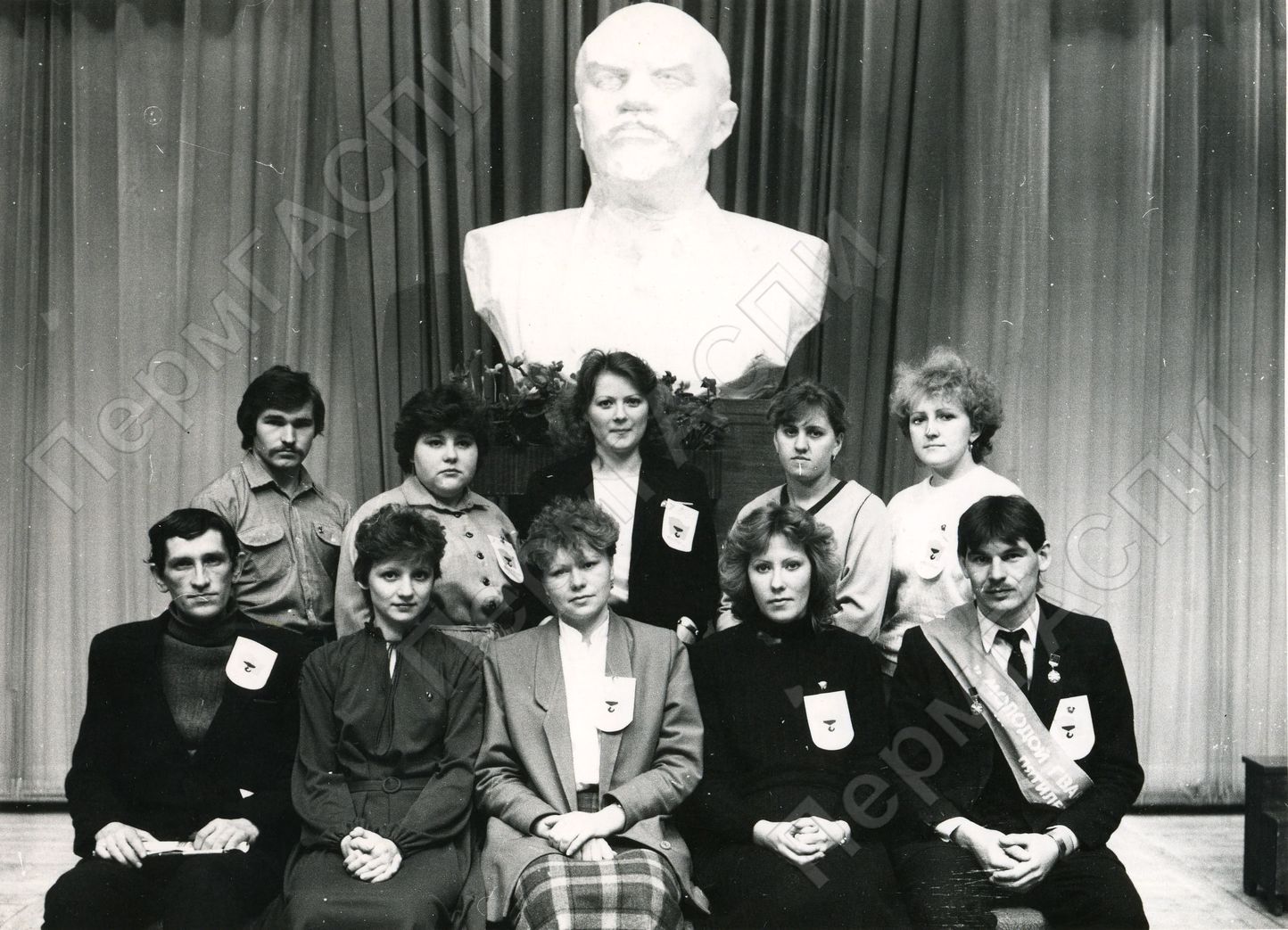 Делегаты комсомольской организации треста 7. (слева направо) 1 ряд) Масленников В. - прораб СМУ-1, Соловьева М. - штукатур маляр СМУ-3, Пулкова Л. Г. - секретарь к/к тр7, Шлыкова Л. - штукатур маляр СМУ-1, Худшин В. - каменщик СМУ-3; 2 ряд: Красносельских Ф. - плотник-бетонщик СМУ-4, Л.Лищура - штукатур маляр СМУ-3, Е. Пестова - штукатут-маляры СМУ-1, О Тарасова - воспитатель детского сада.