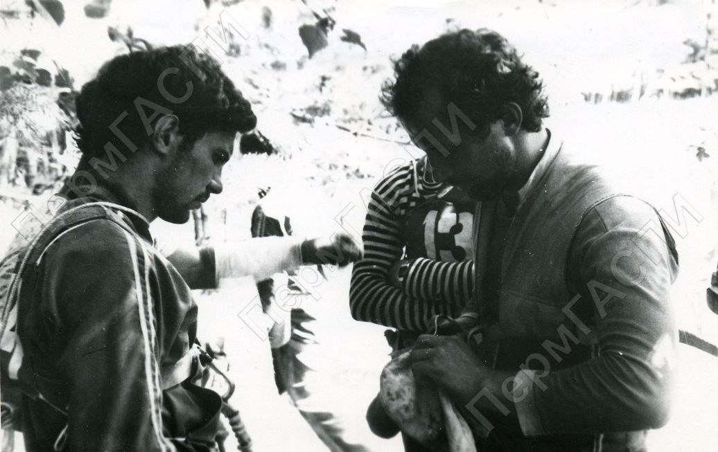 Малых В. А. и Неприяхин А. П. на туристическом этапе "помощь пострадавшему".