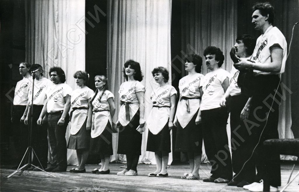 Команда отделочного производства № 1: Рыженков Ю. А., Хадько Г. И., Нагаев Ю. И., Коровякова С. С., Веткина Т. И., Голдобина М. Г., Генкосова О. М., Заставная Л. В, Шилов Ю. И. Бондаренко на выступлении КВН. ДК "Текстильщик"