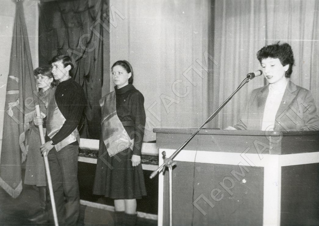 Ася Валиахметова секретарь узлового комитета, посвященному передаче Знамени 94 Осинского стрелкового полка, в честь 40-летия Победы в Великой Отечественной войны. Красный уголок локомотивного депо.