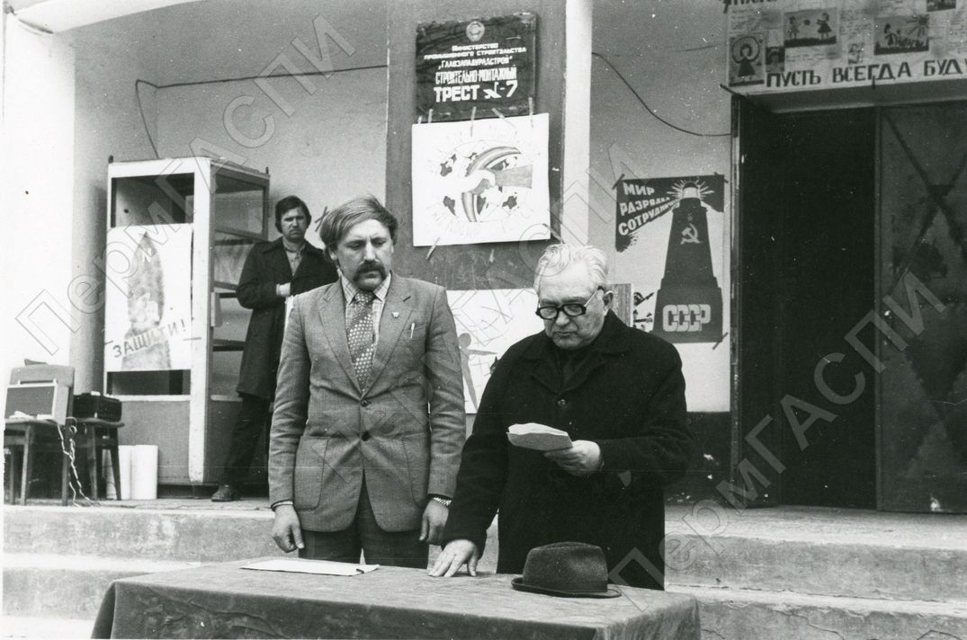 "Марш Мира". Выступает ветеран В.О.В., ветеран труда Фисгейер Арон Соломонович (справа) и секретарь комитета ВЛКСМ треста № 7 Баранов Алексей Иванович (слева)