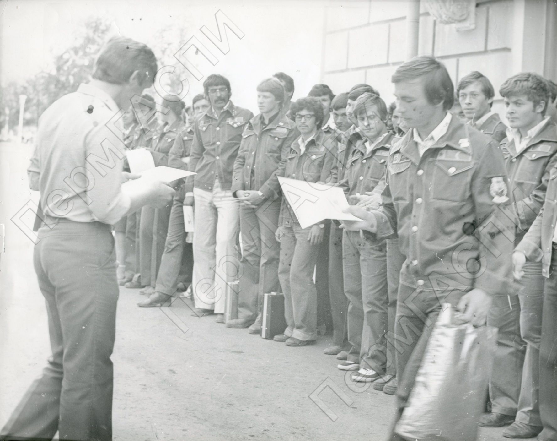 Вручение комсомольских путевок студентам-байцам линейных студенческих отрядов - ЛСО. Пермский сельскохозяйственный институт, на площади оперного театра.