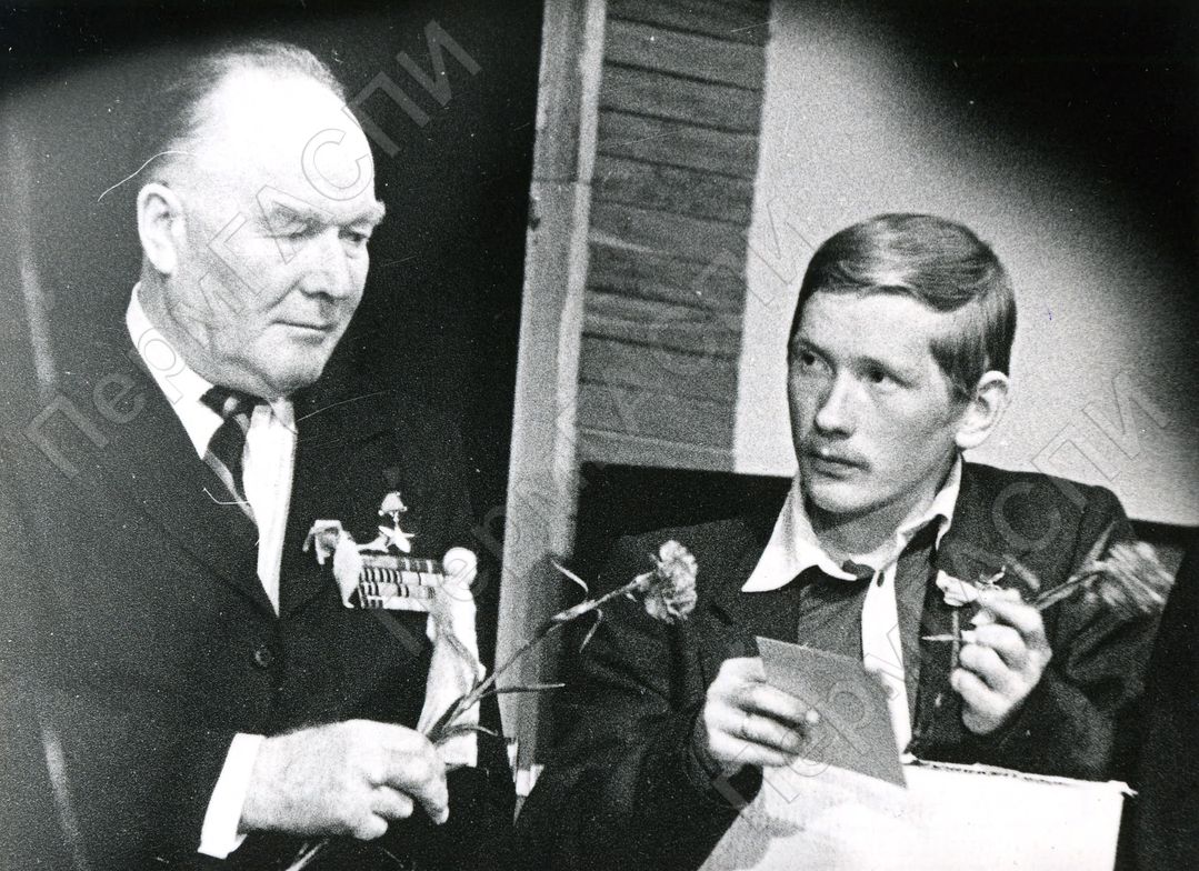 Участники встречи комсомольских поколений округа, посвященной 70-ю ВЛКСМ. Приз победителю окружного соцсоревнования на уборке урожая, Лесникову Григорию Леонидовичу, комбайнеру колхоза "Россия" Кудымкарского района, вручает Крохалев Матвей Павлович - Герой Социалистического Труда.
