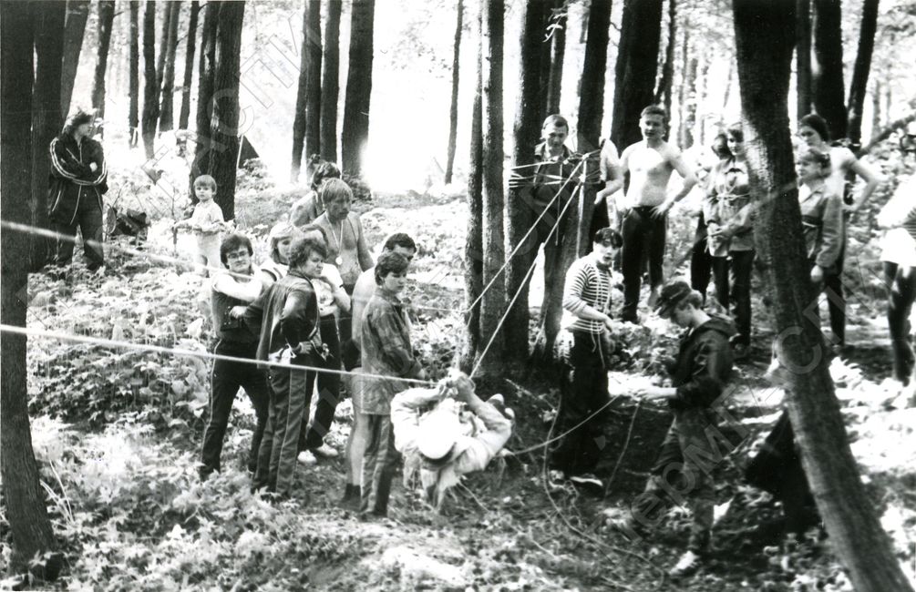 Заводской туристический слет молодежи посвященный 70-летию Октябрской революции, XX съезду ВЛКСМ. Туристическую полосу препятствий проходит команда цеха №3. Переправа через ров с помощью карабинов. Фестиваль поляна электротехнического завода. Заозерье.