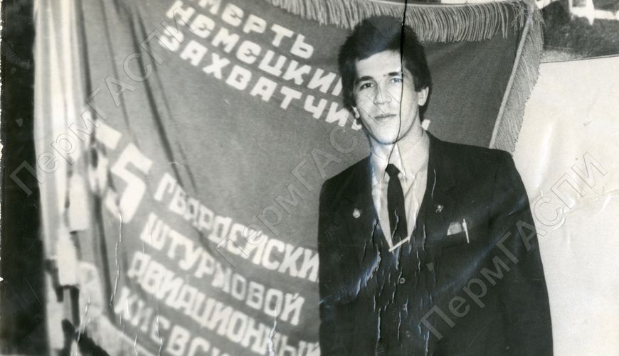 Акция "Равнение на знамена Победы". Передача боевого знамени 155 штурмового авиационного Киевского краснознаменного ордена Кутузова полка комсомольской организации совхоза "Правда". Секретарь комсомольской организации