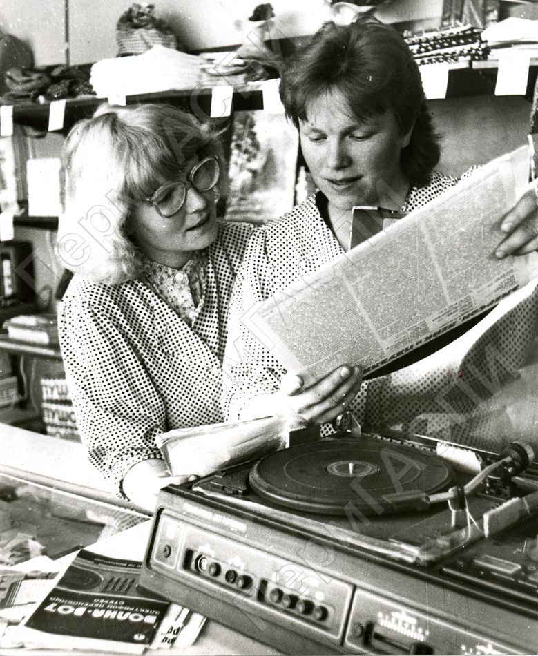Комсомолки, продовцы В-Иньвенсвого промтоварного магазина. Магазин "Промтовары".