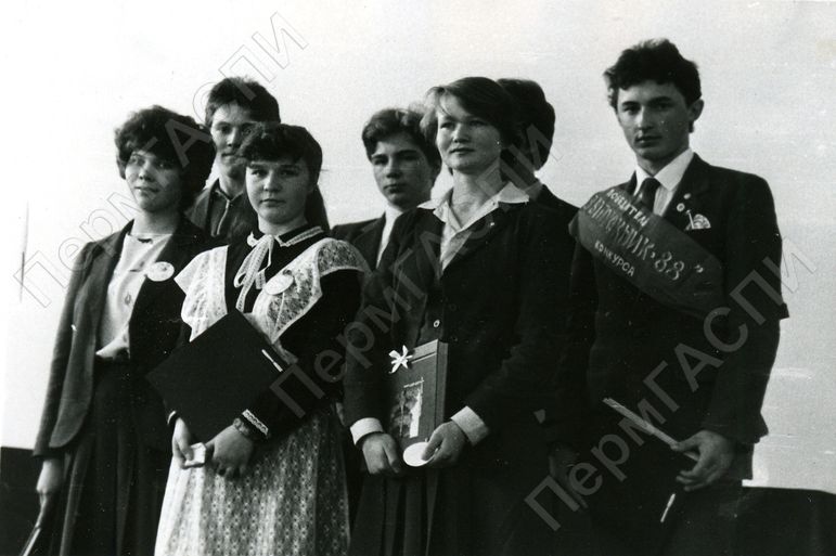 Конкурс "Выпускник-88". Участники конкурса: Балашов Алексей - Большесосновская средняя школа, секретарь комсомольской организации, Карзухина Людмила - Черновская средняя школа, член комитета комсомола, Старцева Ольга - Лёвинская средняя школа, секретарь комсомольской организации, Перескокова Надежда - Кленовская средняя школа, секретарь комсомольской организации, Тихонов Владимир - Петропавловская средняя школа, секретарь комсомольской организации; Харламов Николай - Тойкинская средняя школа, секретарь комсомольской организации; Томилов Валерий - Полозовская средняя школа.