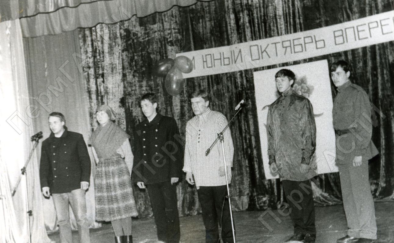 Агитбригада санитарно-гигиенического факуьлтета во время выступления на кончерте XXIX СКТВ санитарно-гигиенического факуьлтета. Большая аудитория главного корпуса мединститута. (справа налево) Суханов М., Лекоцева Ю., Губанов О., Щукин И., Серебряков О., Щумилов Д.