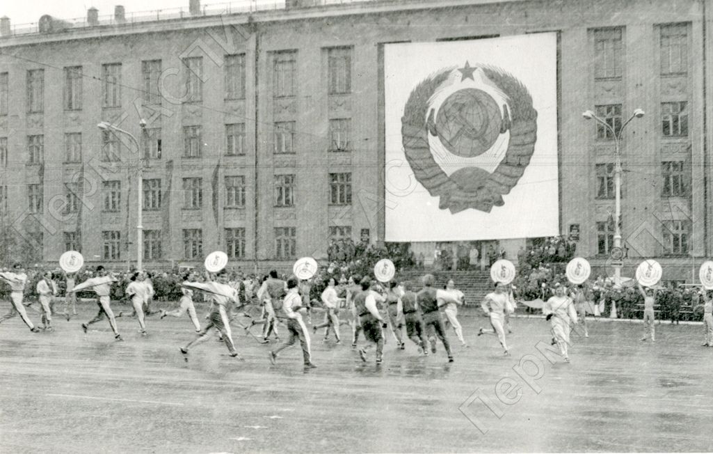 Праздник "Во имя жизни на земле!", посвященный 40-летию Победы Советского народа в Великой Отечественной войне. Выступление ансамбля "Солнечная Радуга" пермского политехнического института. Октябрьская площадь