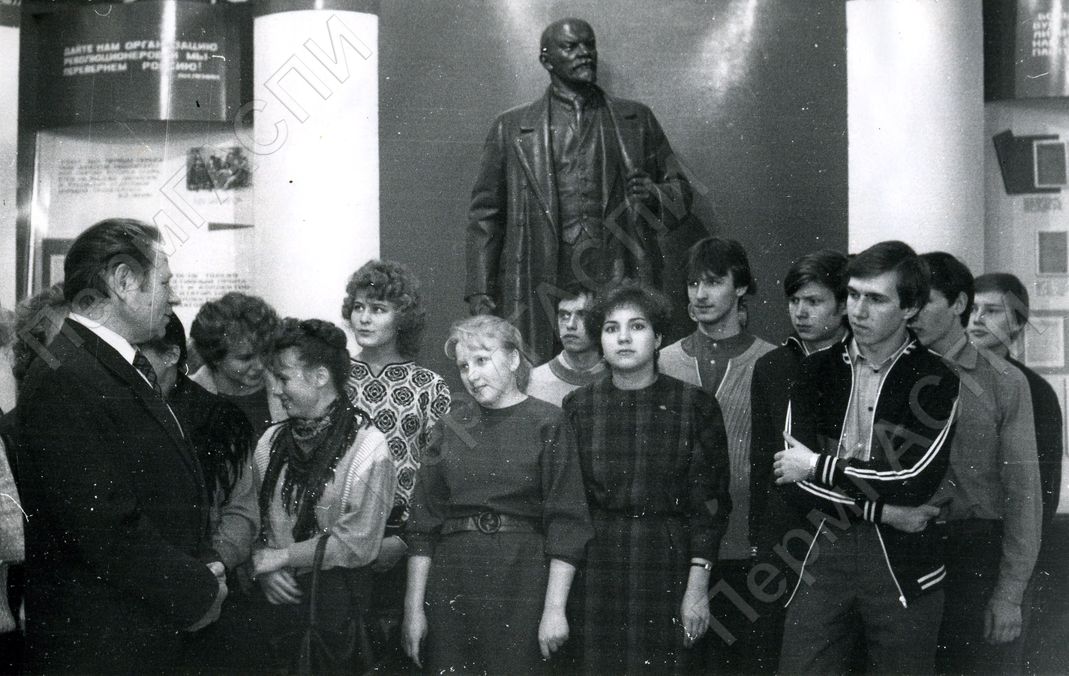 Ветеран Ленинского комсомола Н. Н. Шасахин проводит беседу "О 70-летии ВЛКСМ" с учащимися 10-х классов школы № 12. Музей комсомольской славы.