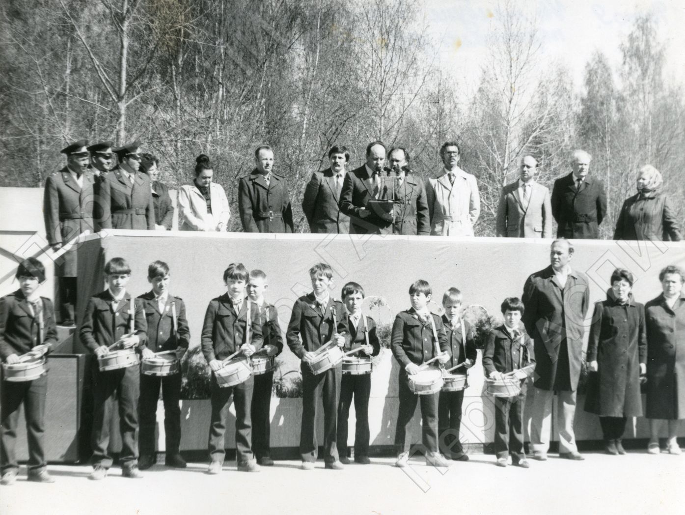 Комсомольцы завода "Камкабель" на торжественном открытии стелы Победы у ДК им. Чехова. На трибуне выступает секретарь парткома завода Беляков Ю.А.