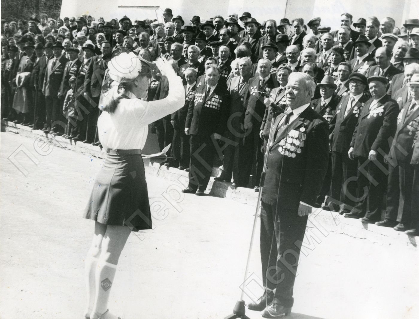 Торжественное открытии стелы Победы у ДК им. Чехова. Рапорт пионерии принимает председатель совета ветеранов Фоминых А.Н.