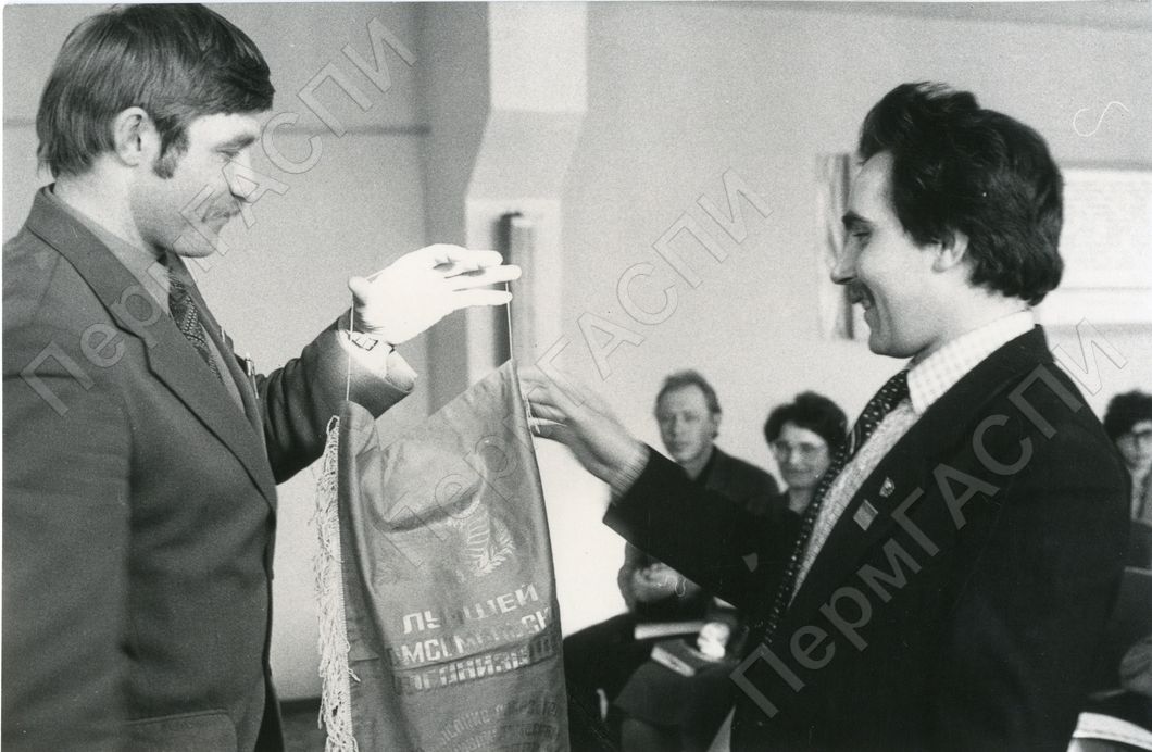 Подведение итогов соцсоревнования среди комсомольских организаций объединения "Уралкалий" за I квартал 1985 года. Актовый зал управления