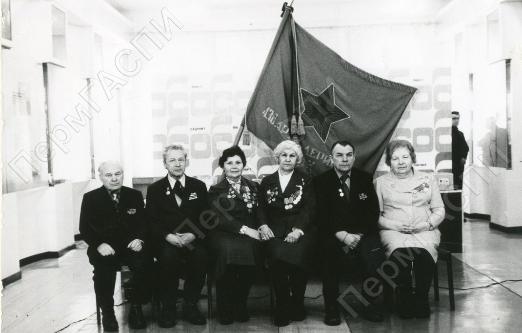 Группа ветеранов В.О.В. у знамени Победы. Музей Боевой и Трудовой Славы ПО "Сода"
