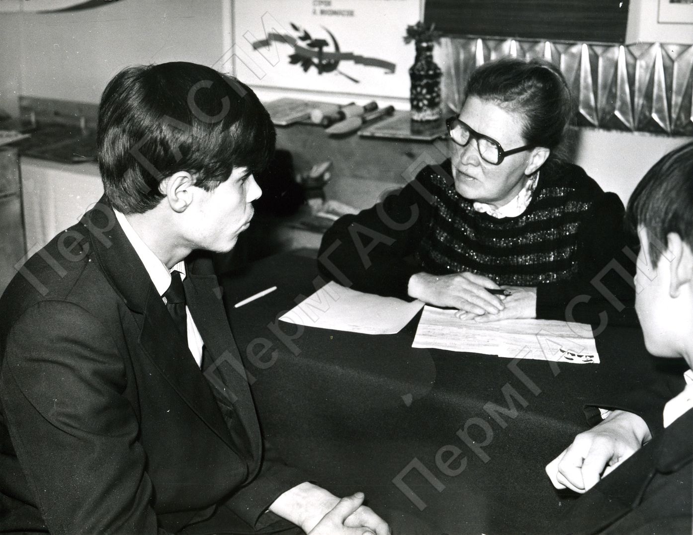 Герой Социалистического Труда Санникова Е. А. ведет беседу с учащимся СПТУ-40 Авдеевым Ю.