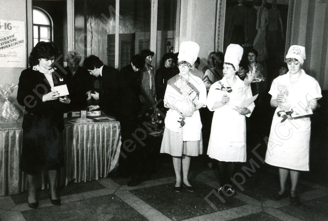 Конкурс в честь XX съезда ВЛКСМ. Награждение участников конкурса производит начальник производственного отдела Терещенко В. П. Победители конкурса среди поваров справа налево: Чуприянова С., Онопенко Т., Суворова Н.