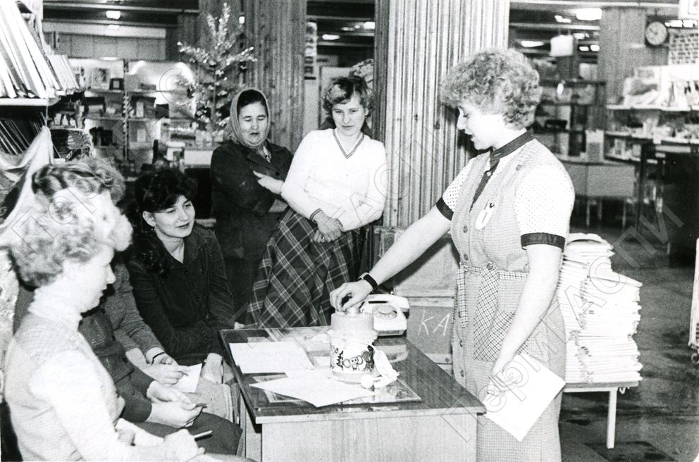 Конкурс профмастерства "Горжусь своей профессией". Силенко Нина дает консультацию по товару. ЦУМ, секция "Канцтовары". (Слева направо) Киселева Е. И., Заяц О., Веретенникова Н., Силенко Н.