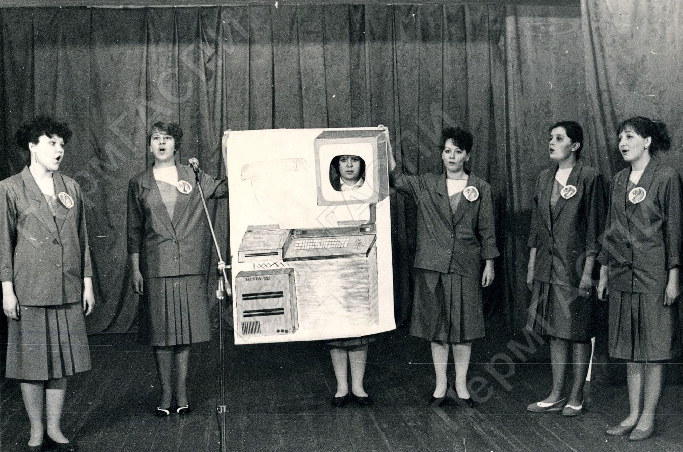Коллектив цеха подготовки тканей в смотре-конкурсе агитбригад. Красный уголок фабрики "Пермодежда". На снимке: Акбаева Лариса, Бусыгина Таня, Булдакова Марина, Кравцова Наталья, Климантова Эмилия.