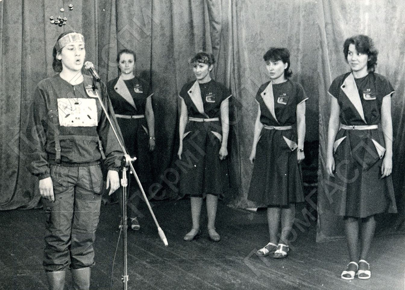 Коллектив раскройного цеха в смотре-конкурсе агитбригад, посвященнуй 70-летию Октября. Красный уголок фабрики "Пермодежда". На снимке: Шубина Наташа, Кудина Люда, Сибирякова Нэлля, Мазунина Таня, Казакова Лено.