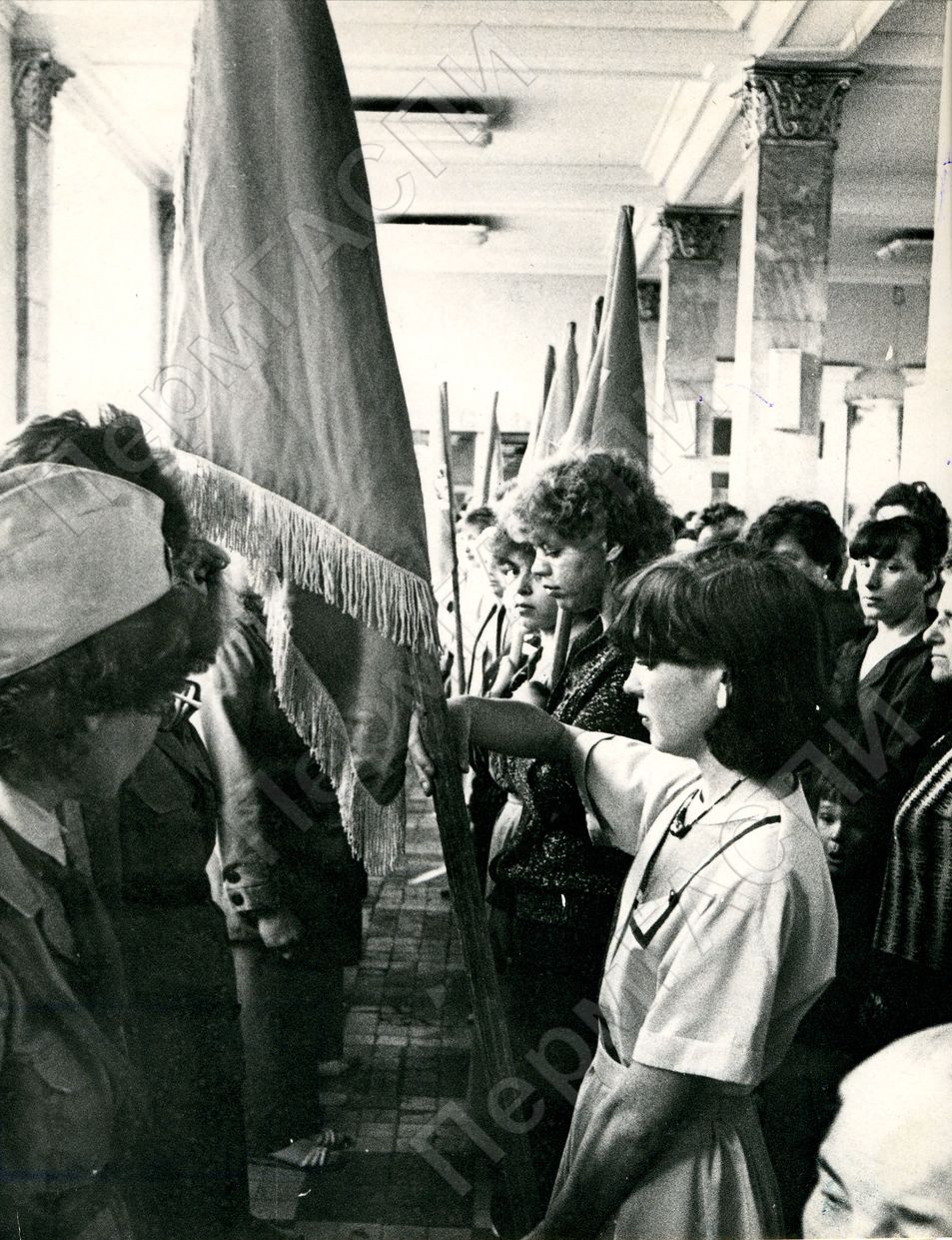 Передача знамен комсомольский актив фабрики передает знамя и отрядные флажки важатым п/лагеря Гайка. Секретарь комитета ВЛКСМ Велякова Вери передает дружинное знамя старшей пионер вожатой Боярщиновой Светлане Леонидовне. Речной вокзал Пермь-I.