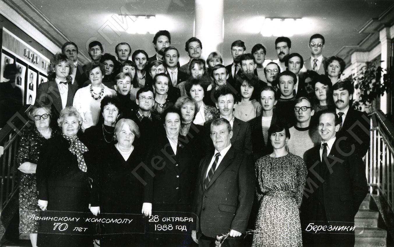 Делегация комсомольской организации управления строительства "Березникихимстрой" на городском торжественном вечере, посвященном 70-летию ВЛКСМ. Дворец культуры им. Ленина.
