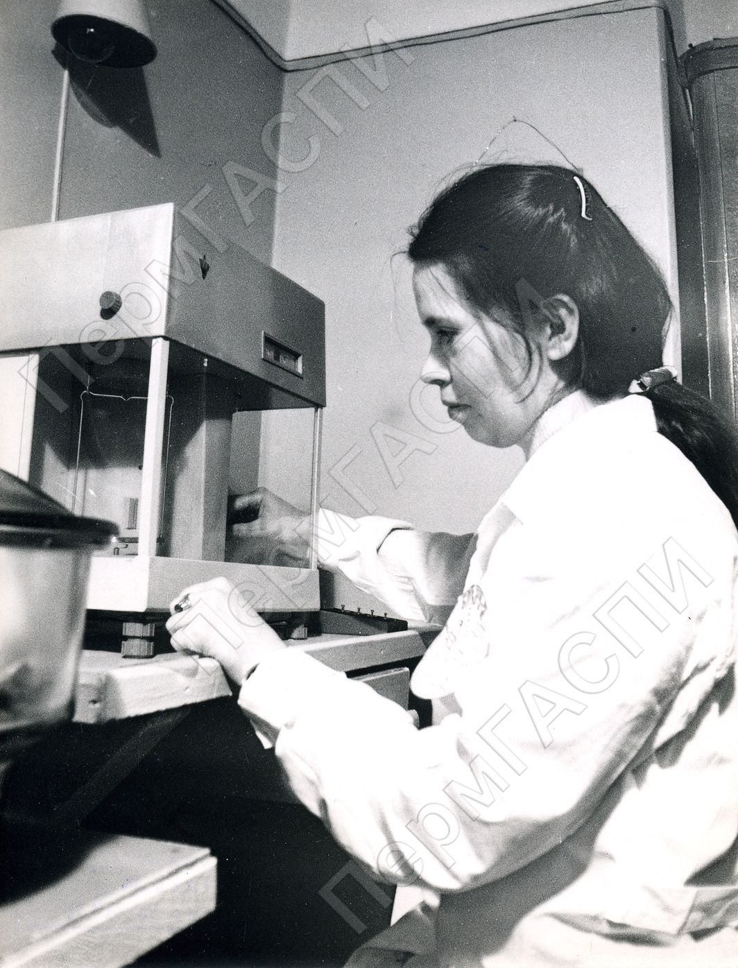 Конкурс профмастерства лаборантов-технологов. Капитан команды отделения ЦЛ фабрики Второго рудоуправления Л. Н. Семейных за выполнением практического задания. Первое Березниковское калийное рудоуправление; центральная лаборатория.