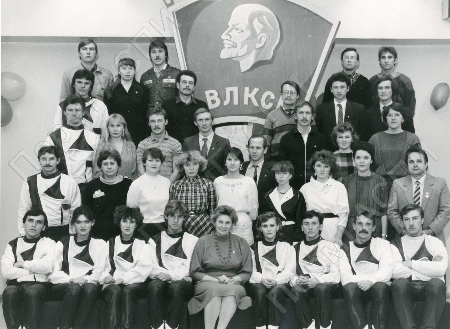 Делегация комсомольской организации управления строительства "Березникихимстрой" на городском торжественном вечере, посвященном 69 годовщине ВЛКСМ. Дворец Металлургов. Оленников А. - член комитета комсомола Кобыльених М. Швелькин М. - член ГК ВЛКСМ Ордин В. - секретарь тр ж/с Мажимов В. Лысов В. - секретарь СУЗ Степанов Д. - секретарь ЗМЗ Мошлоников И. - II секретарь ТК ВЛКСМ Тихообразов А. - секретарь комитета комсомола Багасые Н. - член комитета комсомола Герасимов В. Щербаков Ю. - начальник штаба БКЗМ Петров Ю. Гренядникова Н.- зам. секретарь комитета комсомола Мельниченко Е. Корнеев А. - ветеран комсомола Семшова Т. - секритарь СТМ Дудина И. Чернова И. - секретарь УПТК Мердякова Т. член комитета комсомола Кошарова Л. - зам секретарь комитета комсомола