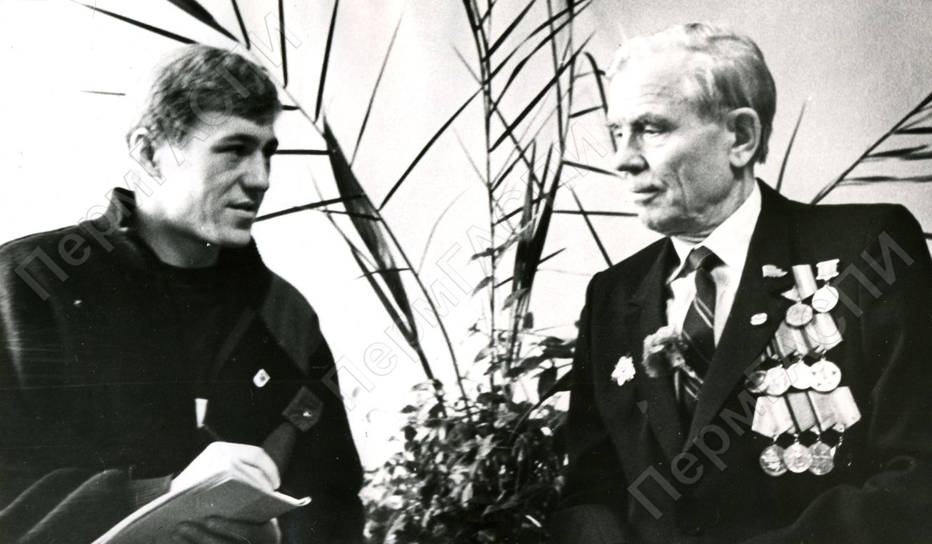 Встреча молодежи с ветеравоми Ленинского комсомола. Актовый зол производственного объединения "Сода". Воин - офганец Семейных Андрей беседует с Ноздачевым Николаем федоровичем.