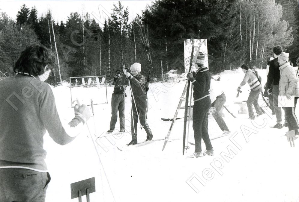 Зимние комбинированные эстафеты молодежи комбината, посвященные 45-летию разгрома гитлеровцев под Москвой на приз комитета комсомола Березниковского титано-магниевого комбината. Член команды филиала Института титана тов. Ершкина Н. принимает эстафету.