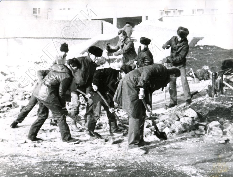 Субботник, посвящещенный достойной встрече XX-го съезда ВЛКСМ. Площадь у ДКиТ Металлургов.