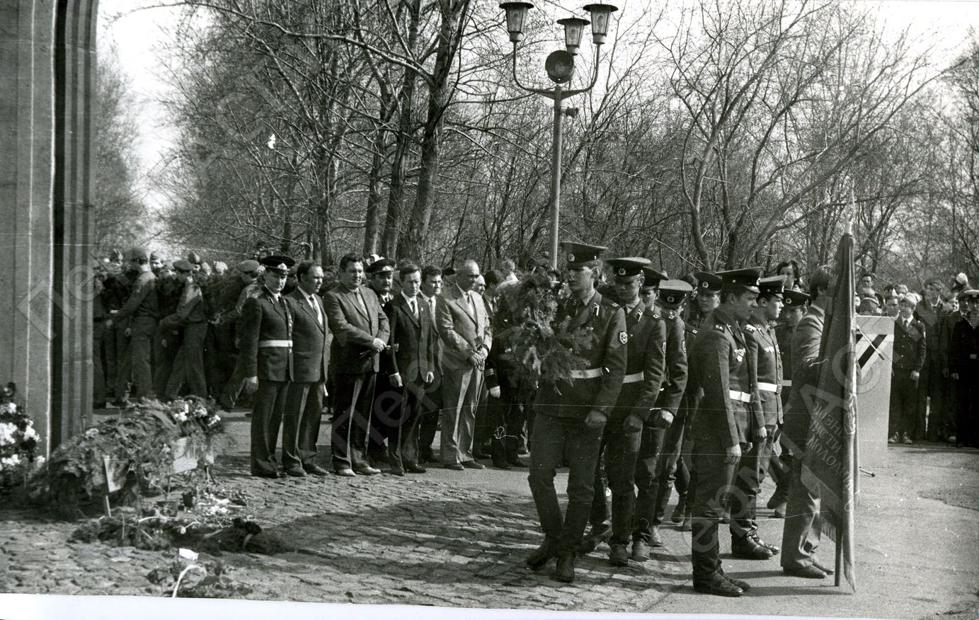 Марш мира, победы и революции. Гирлянду возлагают воины военной части №28060. Мемориал трудового и ратного подвига мотовилихинсцев в годы Великой Отечествественной войны. На заднем планеюноармейцы школы №125. В ценнре: Сниссар А. И. - военный комиссар Мотовилихинского РВК. Худяков Л. С. - председатель Мотовилихинского РВКа. Углич Ю. А. - председатель совета ветеранов войны и труда района. Ким А. Н.,Антипов Ю.И. - секретарь Мотовилихинского РК КПСС,Булаев Ю. А. - директор машиностроительного завода им. В. И. Ленина.