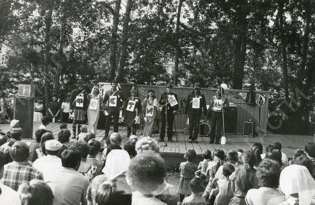 День молодежи. КВН между командами комс. орг. турбогенераторного завода. Выступает команда "Фестиваль". Крайний справа капитан Прохоров Сергей.