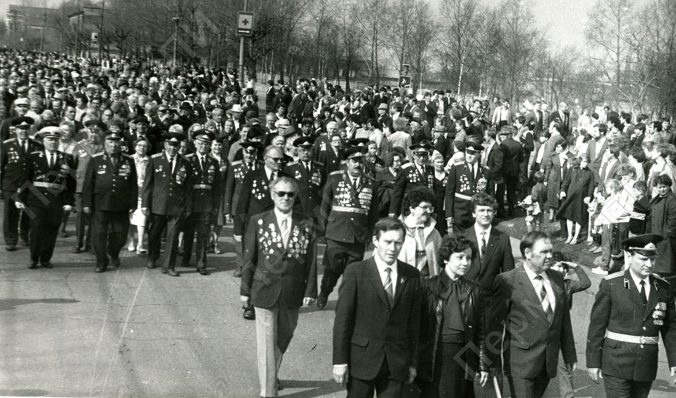 Марш мира, победы и революции. Улица уральская, Мотвилихинский район. На первом плане: Антипов Ю. И. - секретарь Мотвилихинского РК КПСС, Захарова Л. С. - секретарь Мотвилихинского РК КИСС, Худяев Л. С. - председатель Мотвилихинского РИКа, Сниссар А. И. - военный комиссар Мотвилихинского РВК, Королева Н. Н. - зав. отделом пропаганды и агитации РК КПСС, Захаров С. Н. - секретарь РК ВЛКСМ. Дилее ветераны партии, комсомола и Великой Отечественной войны, жители Мотвилихинского района.