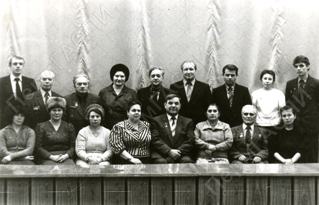Отчетно-выборное собрание секции ветеранов комсомола объединения. Зал заседаний объединения "Моторостроитель" им. В. Ж. Свердлова. В 1-м ряду 4-я ллева: руководитель секции Плоскарева Л. М. Во 2-м ряду крайний справа секретарь комитета ВЛКСМ Каленов А.