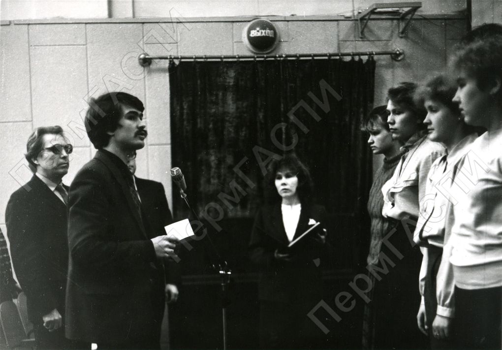 Посвящение в рабочий класс. С реччью обращается секретарь комитета ВЛКСМ тов. Соколов Геннадий. Клуб имени Маяковского. ПО "Машзавод им. Октябрьской революции".