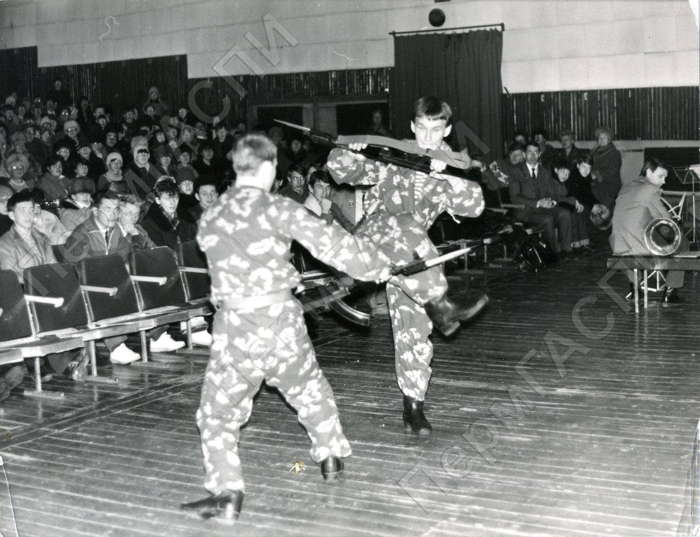 Встреча воинов-интернационалистов с учащимся СПТУ и школ, посвященнай Дню Советской Армии. Показательный бой. Воины-интернационалисты. Кинотеатр "Авангард".