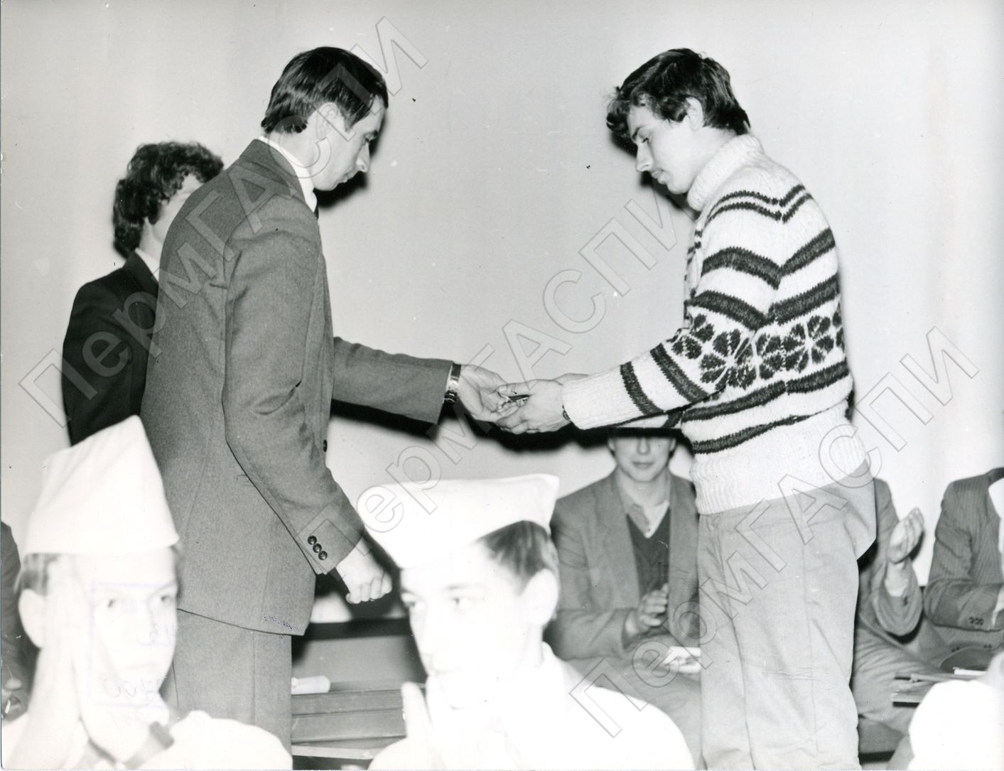 Встреча воинов-интернационалистов с учащимся СПТУ и школ, посвященнай Дню Советской Армии. Кинотеатр "Авангард". 11 сентября Ленинского райкома ВЛКСМ Назаров Н. А. (слева) вручает награду - -интернационалисту Некуш Ю. (справо).