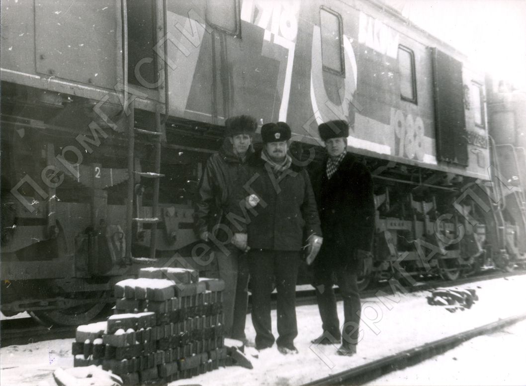 Станция "Березники". В. Пузырев, первый секретарь Советского РК ВЛКСМ; В. Колотушкин, секретарь комитета ВЛКСМ железнодорожного узла; С. Третьяков, машенист, перед отправлением тяжеловесного состава в честь 70-летия ВЛКСМ.