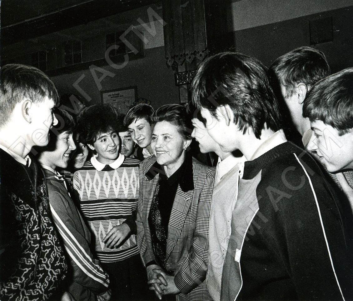 В гостях у студентов Пермского электромеханического техникума Марина Лаврентьевна Попович: летчик-испытатель1-го класса, полковник, кандидат технических наук, неоднократная рекордсменка мира, член Союза журналистов СССР. Электромеханический техникум.