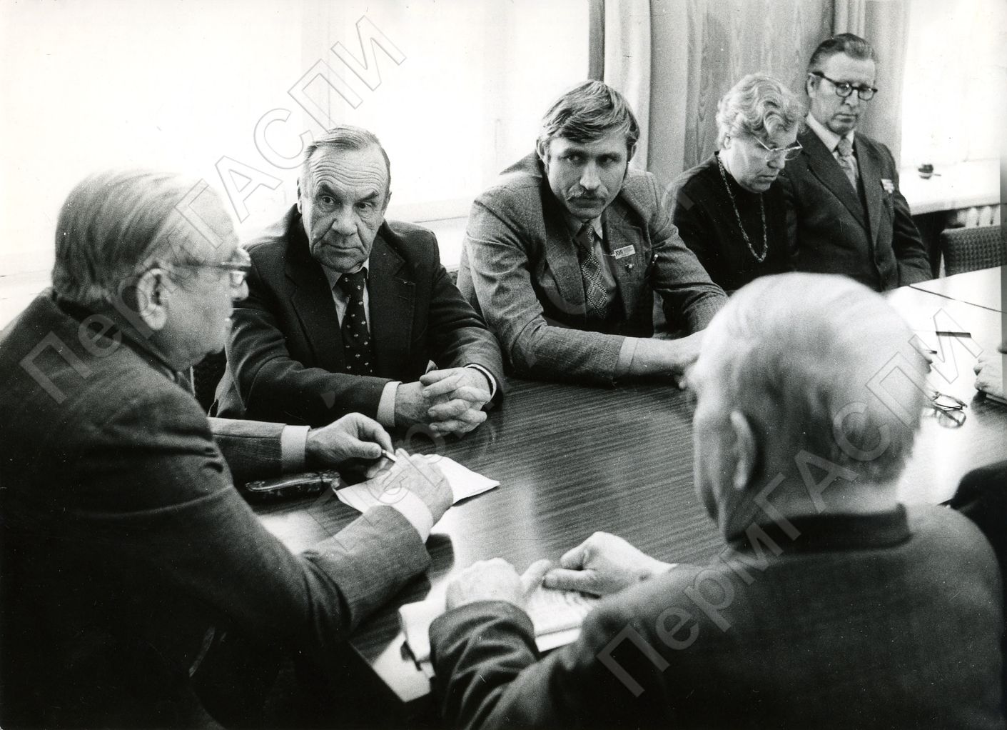 Заседание Совета ветеранов Ленинского комсомола производственное объединение "Уралкалий". Председатель Совета Казакевич Владимир Игнатьевич, слева от него - Коновалов К. И., член Совета; Яголников Б. Д., секретарь комитета ВЛКСМ объединенения "Уралкалий".