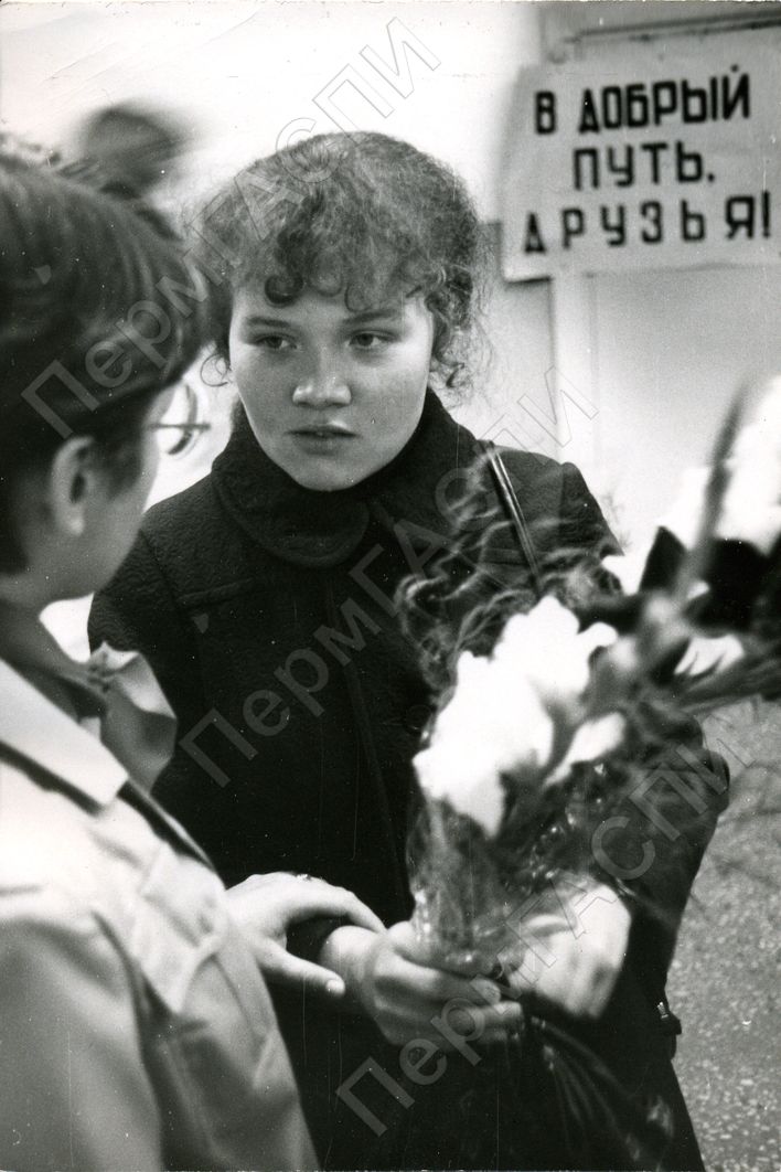 Секретарь комсомольской организации управления механизации УС "Березникихимстрой" Мартюгиева Татьяна (справа) поздравляет с началом учебного года старшую пионервожатую подшефной школы №8 Вакульчук Елену. Школа №8.