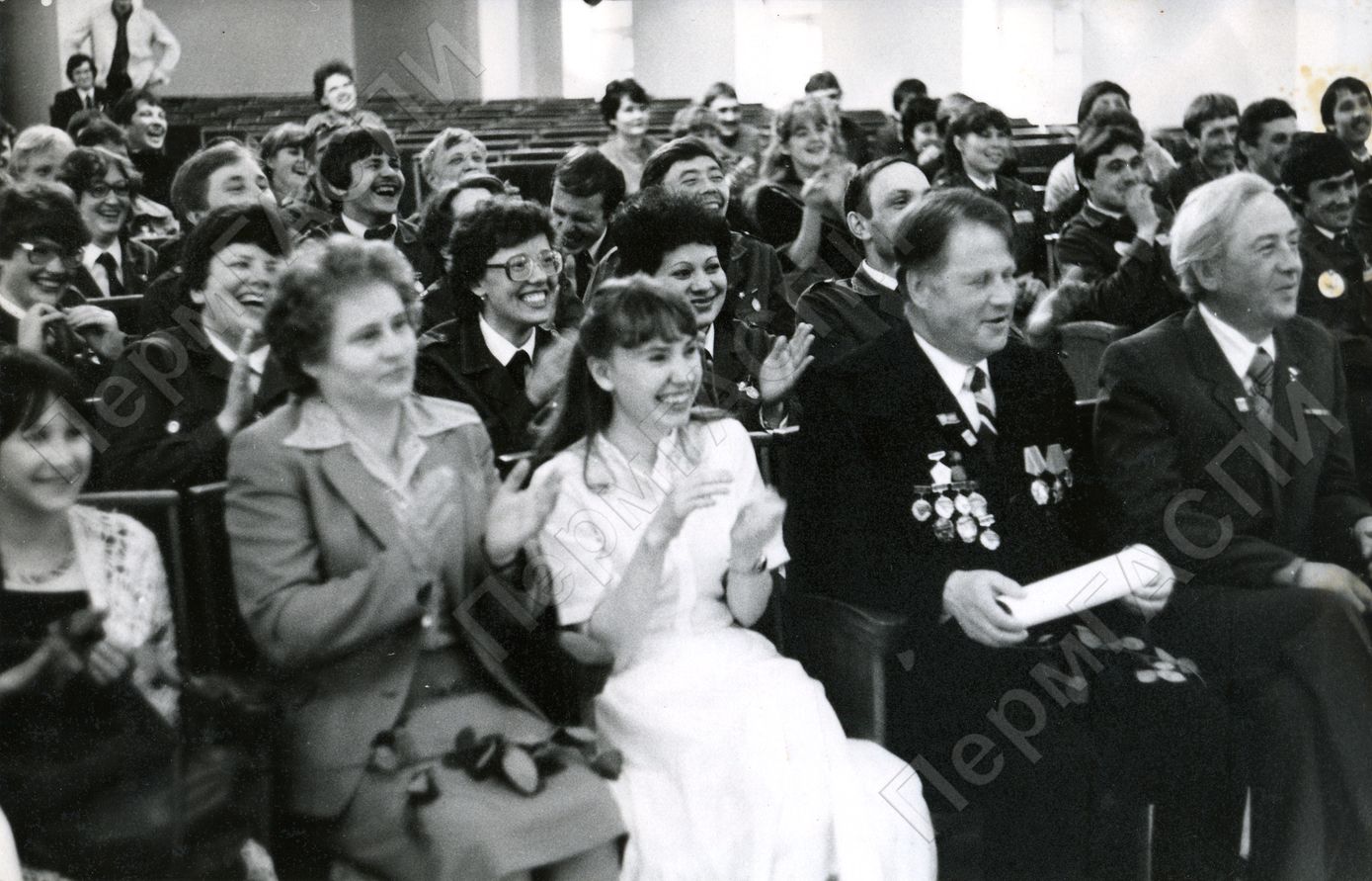 Вечера встречи бойцов Ударного отряда имени 40-летия Победы с комсомольцами, приставшими по комсомольским путевкам в 1956 году на строительство химической промышленности. Клуб "Строитель", пр. Ленина, 47.
