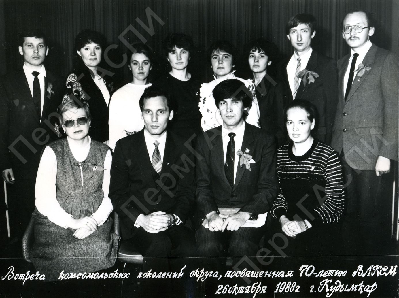Участники встречи комсомольских поколений округа, посвященной 70-летию ВЛКСМ. Драмтеатр. 1 ряд (слева направо): 1. Поспелова Елена Павловна, инструктор окружкома ВЛКСМ. 2. Рычков Виктор Васильевич, 1 секретарь окружкома ВЛКСМ. 3. Мальцев Герман Ивановия, 1 секретарь Кудымкарского ГК ВЛКСМ. 4. Пономрева Людмила Юрьевна, зав. общим отделом ОК ВЛКСМ. 2 ряд (слева направо): 1. Лунегов Василий Дмитриевич, 2 секретарь окружкома ВЛКСМ. 2. Тебенькова Ирина Валерьевна, инструктор идеологического отдела окружкома ВЛКСМ. 3. Тарасова Людмила Петровна, зав. отделом работающей молодежи. 4. Федосеева Рима Семеновна, бухгалтер окружкома ВЛКСМ. 5. Мишурова Галина Константиновна, секретарь, зав отделом учащейся молодежи и пионеров окружкома ВЛКСМ. 6. Лунегова Надежда Леонидовна, секретарь-машенистка ОК ВЛКСМ. 7. Данилченко Валерий Юрьевич, зав. организованным отделом окружкома ВЛКСМ. 8. Бражкин Владимир Иванович, 2 секретарь Кудымкарского ГК ВЛКСМ.