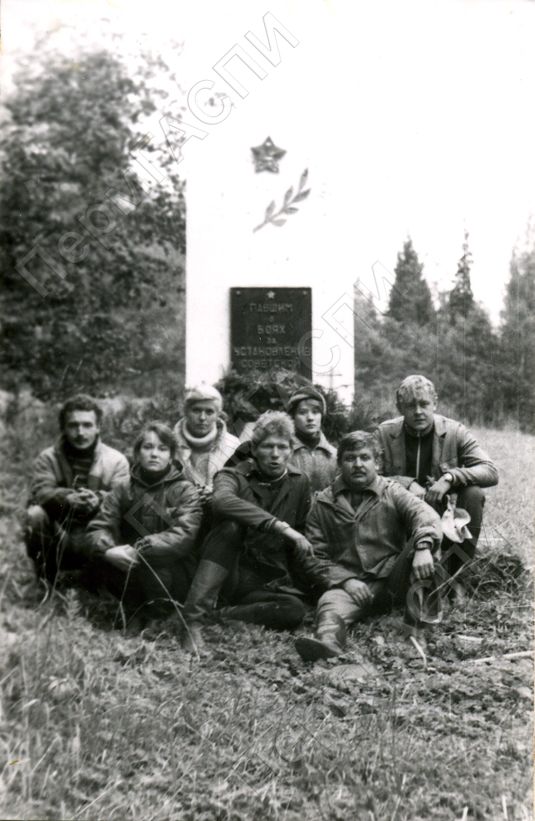 Участники конного похода по местам боевой и революционной славы Лысьвенского района, посвященного 70-летию ВЛКСМ у памятника "Павшим в боях за установление Советской власти на Урале". Участники похода: Верхний ряд: Весепков А. - инструктор конноспортивной секции, Микрюкова Е. - зав.секторомучета УК ВЛУСМ, Калиничева О. - статист сектора учета, Мартынов А. - секретарь ЗК ВЛКСМ ЛМЗ. Нижний ряд: Вахитова Э. - инструктор ГК ВЛКСМ, Нечаев С. - старшина милицииОВД, Валиахметов В. - электромонтер ЛМЗ.