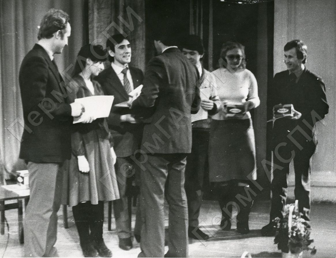 Конкурс "А ну-ка, парни!" Третий слева победитель конкурса секретарей комсомольской организации цеха 44 Трубников И.П. Приз вручает секретарь комитета ВЛКСМ Конивец А.В. ДКиТ им. Я.М. Свердлова
