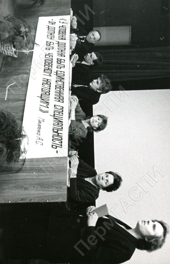 Собрание комсомольского актива Березниковского титано-магниевого комбината "О совершенствовании шефской работы". В президиуме (слева направо): председатель секции ветеранов Ленинского комсомола БТМК Алексеев А. М., I секретарь Советского РК ВЛКСМ Пузырев В. В., секретарь комитета ВЛКСМ БТМК Маркеев И. А., зам. секретаря комитета ВЛКСМ БТМК Жданова Е. А., зам. секретаря парткома БТМК по идеологии Журавлева Р. А. Выступает зам. председателя профкома Монина Н. Г.