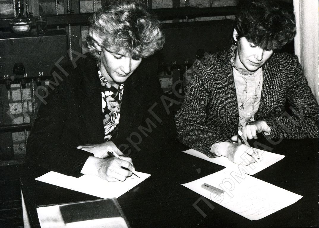 Отчетно-выборная партийная конференция Березниковского титано-магниевого комбината. Делегаты от комсомольской организации Запивалова Светлана Петровна - секретарь комсомольской организации ЖКУ БТМК, Кузнецова Морина Леонидовна - член комитета комсомола комбината. Дворец культуры и техники Металлургов.