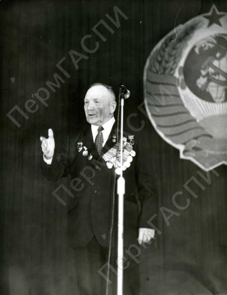 Вечер "Встреча поколений", посвященный 70-летию Ленинского комсомола. Выступает представитель секции ветеранов Ленинского комсомола Березниковского титано-магниевого комбината, ветеран отечественной войны Алексеев Александр Михайлович. Дворец культуры и техники Металлургов.